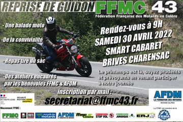 Le samedi 30 avril, vous faites quoi ? La FFMC43 vous propose de venir participer gratuitement à sa journée « reprise de guidon », ça ne fait pas de mal, 0 la sortie de l’hiver. Ouverte à toutes et tous vous pourrez participer à des ateliers encadrés par les bénévoles FFMC43 et AFDM (des motards super sympa, vous verrez !). Un représentant de la mutuelle des motards sera présent En fin de matinée, vous partirez en balade (95 kms maximum) toujours encadrés par nos bénévoles qui continueront de dispenser conseils et astuces. N’oubliez pas votre repas tiré du sac, sinon... il faudra tenir jusqu’au soir. Si vous venez un peu avant 9H, le café vous sera offert.